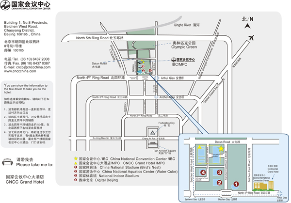 地址:北京市朝陽區(qū)天辰東路7號 郵編:100105 總機:+86 10 8437 3300 【乘車路線】 地鐵路線:可乘地鐵五號線惠新西街南口站,轉(zhuǎn)乘地鐵十號線北土城站,轉(zhuǎn)乘地鐵8號線奧林匹克公園站E出口步行320米 【駕車路線】 沿四環(huán)主路向西行駛,過安慧橋出主路至北四環(huán)中路輔路,走一公里后,北辰西橋下右轉(zhuǎn)至北辰西路,沿北辰西路行駛1.5公里,右轉(zhuǎn)進入大屯路,沿大屯路行駛377米,右轉(zhuǎn)進入天辰東路,沿天辰東路行駛381米,到達國家會議中心。 |