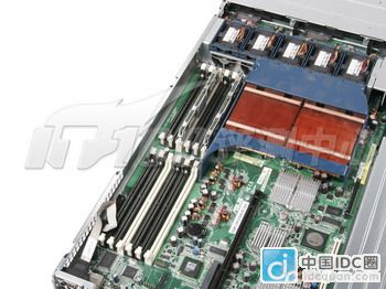 RS162-E4/RX服務(wù)器采用了7組12個40mm x 28mm系統(tǒng)風(fēng)扇,其中的5組為兩兩串聯(lián)為關(guān)鍵設(shè)備提供更大的風(fēng)量。如上圖所示,其中的3組通過導(dǎo)風(fēng)罩為處理器散熱器散熱,而另外的兩組則為FB-DIMM內(nèi)存散熱。該服務(wù)器所采用的主板并沒有將內(nèi)存設(shè)計在處理器所在的通道上,這樣系統(tǒng)風(fēng)扇就可以分別為處理器和FB-DIMM內(nèi)存這兩個發(fā)熱大戶散熱,從而提供更好的散熱效果。