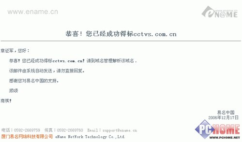 報(bào)道中提及的域名是cctvs.com.cn和ccctv.com.cn,報(bào)道中還提供了注冊(cè)成功通知信的截圖如下: