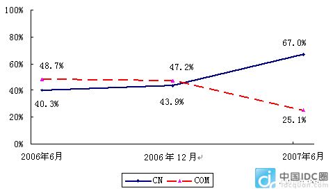 數(shù)據(jù)顯示,網(wǎng)站傳統(tǒng)上使用的境外域名需要到國外的服務(wù)器進行解析,面臨各種不可抗拒力因素(地震)導致的網(wǎng)路鏈接不通的問題,存在著信息安全隱患。2007年,在一元CN域名全民體驗活動的帶動下,中國的國家頂級域名取得了爆炸式增長,成為全球第二大國家頂級域名,實現(xiàn)了對.COM的大幅度超越;與此同時大量的網(wǎng)站啟用.CN域名,鞏固了國內(nèi)主流域名的地位,CN下網(wǎng)站數(shù)首次大幅度超過COM下網(wǎng)站數(shù),大幅度降低了安全隱患。 |