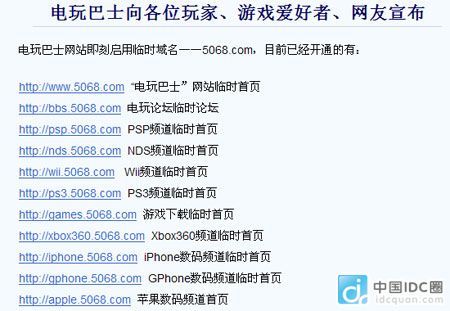 電玩巴士公告頁面截圖 中國IDC圈2月26日報道:電玩巴士(tgbus.com)今日公告稱“即日起啟用臨時域名——5068.com”,以應對域名被停止解析。 中國萬網于昨日向媒體通發(fā)聲明表示,2月20日接到上級主管部門的通知,要求對部分網站停止域名解析。萬網在接到該通知后,對列明的網站,包括電玩巴士(tgbus.com)進行了停止域名解析操作,tgbus.com目前域名無法訪問。 電玩巴士今日公告稱,啟用臨時域名——5068.com,目前已經開通的頁面包括網站臨時首頁、臨時論壇以及之前的各個頻道臨時頁面,但并未透露何時恢復使用tgbus.com域名。 |