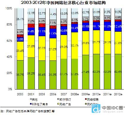 2003-2008年中國(guó)網(wǎng)絡(luò)經(jīng)濟(jì)細(xì)分行業(yè)市場(chǎng)份額數(shù)據(jù)顯示,2008年網(wǎng)絡(luò)廣告和網(wǎng)絡(luò)游戲依然是網(wǎng)絡(luò)經(jīng)濟(jì)營(yíng)收的主要來(lái)源,兩者占比為70.5%.其中網(wǎng)絡(luò)游戲增長(zhǎng)穩(wěn)定,市場(chǎng)份額為37.8%,與07年相比基本持平;受奧運(yùn)因素的顯著拉動(dòng),2008年網(wǎng)絡(luò)廣告市場(chǎng)規(guī)模達(dá)180億元,市場(chǎng)份額增至32.7%。而B(niǎo)2B電子商務(wù)、旅行預(yù)訂、網(wǎng)絡(luò)招聘分別在奧運(yùn)、金融影響下市場(chǎng)份額都有所下降。 奧運(yùn)、經(jīng)濟(jì)危機(jī)合力影響,各領(lǐng)域增勢(shì)差異顯著