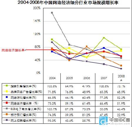 2003-2008年互聯(lián)網(wǎng)經(jīng)濟(jì)細(xì)分行業(yè)市場(chǎng)規(guī)模增長(zhǎng)率數(shù)據(jù)顯示,2008年網(wǎng)絡(luò)購(gòu)物和網(wǎng)絡(luò)廣告在保持高速增長(zhǎng)的同時(shí),成為拉動(dòng)互聯(lián)網(wǎng)經(jīng)濟(jì)增長(zhǎng)的主動(dòng)力;B2B電子商務(wù)、旅行預(yù)訂、網(wǎng)絡(luò)招聘等行業(yè)受經(jīng)濟(jì)危機(jī)負(fù)面影響較大,在增速低于07年的同時(shí),也低于互聯(lián)網(wǎng)整體增長(zhǎng)。 網(wǎng)絡(luò)廣告成最大動(dòng)力:品牌網(wǎng)絡(luò)廣告和搜索引擎市場(chǎng)在奧運(yùn)拉動(dòng)下增長(zhǎng)率都達(dá)到70%左右,成為拉動(dòng)08年互聯(lián)網(wǎng)經(jīng)濟(jì)增長(zhǎng)的最大動(dòng)力。搜索引擎市場(chǎng)年度增速較07年的翻番增長(zhǎng)有所降低,主要原因在于奧運(yùn)期間廣告主更加注重企業(yè)影響力提升,廣告投放傾向于品牌廣告。 網(wǎng)絡(luò)游戲穩(wěn)定增長(zhǎng):道具收費(fèi)比例上升以及玩家消費(fèi)更加理性,網(wǎng)絡(luò)游戲市場(chǎng)增長(zhǎng)52.2%,與07年的77.3%相比下降幅度較大;但基于龐大的用戶(hù)規(guī)模及較高的ARPU值,增速依然高于互聯(lián)網(wǎng)經(jīng)濟(jì)整體。 企業(yè)付費(fèi)受較大影響:全球經(jīng)濟(jì)危機(jī)導(dǎo)致投融資趨于謹(jǐn)慎、市場(chǎng)增長(zhǎng)趨緩,歐美等海外市場(chǎng)需求緊縮,對(duì)企業(yè)付費(fèi)領(lǐng)域有較大影響,拖累整體互聯(lián)網(wǎng)經(jīng)濟(jì)增長(zhǎng)。其中較多依賴(lài)外貿(mào)的B2B電子商務(wù)增速被拉低至46.4%;網(wǎng)絡(luò)招聘市場(chǎng)由于雇主數(shù)量和單個(gè)雇主招聘費(fèi)用降低,市場(chǎng)增速下滑至13.4%。 |