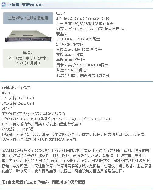 有孚網(wǎng)絡(luò)是中國領(lǐng)先的增值電信運(yùn)營商,提供專業(yè)的主機(jī)租用和服務(wù)器租用等服務(wù)。在上海電信武勝路、橫浜橋、云蓮、復(fù)旦復(fù)華、外高橋、漕溪路、同普路等七大電信級機(jī)房管理著大量服務(wù)器集群。在北方與天津網(wǎng)通獨(dú)家合作,管理著天津網(wǎng)通中心機(jī)房,總帶寬21G直連北京核心節(jié)點(diǎn)。有孚網(wǎng)絡(luò)和Intel、寶德等服務(wù)器生產(chǎn)商戰(zhàn)略合作,不斷推出適合IDC應(yīng)用的高性能服務(wù)器。無論是企業(yè)應(yīng)用、電子商務(wù),還是游戲運(yùn)營,有孚網(wǎng)絡(luò)都是最佳選擇! 以下是有孚64位租用服務(wù)器詳情:
