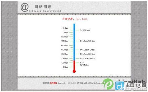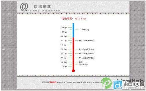 網(wǎng)速測(cè)試(加速后) 從上面兩張圖中可以很清楚的看出,在使用盈速通之前筆者連接到東方熱線的速度為197.7Kbps,而在連接上盈速通網(wǎng)絡(luò)加速軟件之后其連接速度高達(dá)861.9 Kbps,加速效果相當(dāng)明顯。 四、Web網(wǎng)站測(cè)試站點(diǎn)網(wǎng)速連接測(cè)試 接下來我們進(jìn)入這次測(cè)試的最后一個(gè)環(huán)節(jié),就是利用一家擁有電信服務(wù)器的網(wǎng)站所提供的在線網(wǎng)速測(cè)試。我們選擇的測(cè)試站點(diǎn)是浙江寧波的"東方熱線"所提供的測(cè)試服務(wù),該網(wǎng)站的服務(wù)器所接入的寬帶是寧波電信。