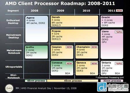 根據(jù)這份路線圖,AMD 32nm處理器在高端桌面是“Orochi”,核心數(shù)量多于四個,緩存也在8MB以上,內(nèi)存控制器僅支持DDR3;主流桌面和筆記本是“Llano”,四核心,4MB緩存,支持DDR3,并且會集成GPU圖形核心,也就是AMD提出的“APU”。