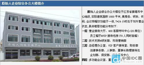 機(jī)房于2008年1月全面測試,2月底正式投入使用。二期工程將于一期工程銷售至70%時(shí)全面啟動,屆時(shí)機(jī)房機(jī)架總數(shù)將達(dá)到1000個,接入總骨干帶寬約為50G,為入駐用戶的后續(xù)長期戰(zhàn)略發(fā)展提供堅(jiān)強(qiáng)保證。 原始人網(wǎng)絡(luò)為江蘇省正規(guī)ISP接入服務(wù)商,雖成立時(shí)間才1年半,但依仗雄厚的資金和技術(shù)實(shí)力,擁有1800平米的綜合辦公大樓,相關(guān)部門設(shè)置完善,文化和經(jīng)營理念成熟,同時(shí)我們也希望能有更多的賢才加盟我公司,共創(chuàng)偉業(yè)! 原始人企業(yè)綜合辦公大樓簡介