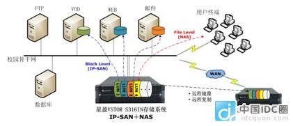 經(jīng)過對福田區(qū)教育局的信息建設(shè)需求的充分研究后,提出了以IP-SAN+NAS的解決方案來實現(xiàn)校園數(shù)據(jù)的集中管理。在方案中,星盈科技使用了高性價比、高效能VSTOR S316IN存儲系統(tǒng)。通過VSTOR S316IN能夠?qū)⒋疟P空間切分成合適的大小,映射給前端的應(yīng)用服務(wù)器使用,構(gòu)建成快速的IP-SAN存儲架構(gòu),同時,校園用戶也可以通過以太網(wǎng)直接訪問存儲設(shè)備,在S316IN上進行文件的備份或讀取操作。在安全性考慮上,VSTOR S316IN存儲系統(tǒng)在控制器、緩存、磁盤、電源、散熱系統(tǒng)等都采用了冗余設(shè)計,最大程度排除了因為故障而宕機的可能性。此外,VSTOR S316IN還支持本地鏡像(Local Mirror)、虛擬卷拷貝(Volume Copy)、虛擬卷映射(Duplication)的高級數(shù)據(jù)功能,甚至還能通過遠程復(fù)制(Remote Replication)、遠程鏡像(Remote Mirror)功能實現(xiàn)數(shù)據(jù)的遠程災(zāi)備,保障信息系統(tǒng)的數(shù)據(jù)安全。