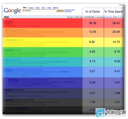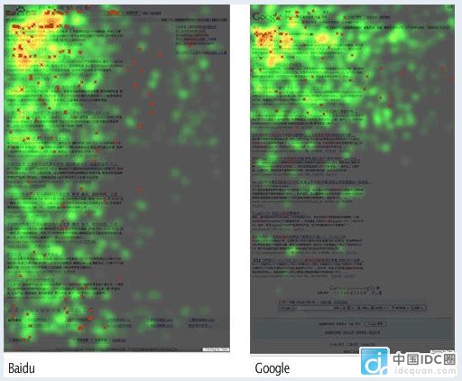 07年的時(shí)候在搜索引擎研究領(lǐng)域出現(xiàn)一張Google和百度的點(diǎn)擊熱圖(如下),圖的出處未知,但是從圖中可以看出google和百度用戶行為的顯著區(qū)別,也可以看出在這兩個(gè)搜索引擎中排名網(wǎng)站的流量分配的大概情況。