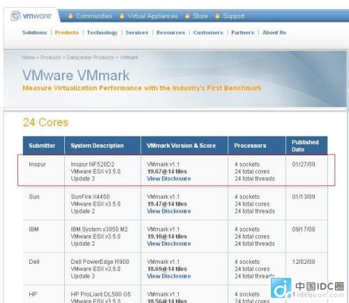 中國IDC圈2月12日報道:日前,在國際權(quán)威的VMmark虛擬化性能測試中,浪潮創(chuàng)造了虛擬化應(yīng)用效能的嶄新高度。采用英特爾7400平臺的浪潮四路服務(wù)器,在VMmark 24核組別的測試中,以19.67@14tiles的成績奪得第一名,這也是國產(chǎn)品牌在虛擬化領(lǐng)域的首個世界紀(jì)錄。該成績表明,相比于其他平臺,浪潮服務(wù)器能夠為用戶虛擬化應(yīng)用提供更高的整合密度、更強的性能和更低的成本,對于推進虛擬化應(yīng)用普及具有重要意義。同時,此次測試體現(xiàn)浪潮在虛擬化領(lǐng)域方案開發(fā)和優(yōu)化能力已居于業(yè)界領(lǐng)先水平,將有助于浪潮虛擬化戰(zhàn)略乃至整體高端戰(zhàn)略實施。