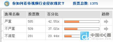 調(diào)查顯示,42.55%的網(wǎng)友認(rèn)為目前中國視頻行業(yè)侵權(quán)現(xiàn)象嚴(yán)重,近40%的網(wǎng)友認(rèn)為并不嚴(yán)重,另外有20.44%的網(wǎng)友未表明態(tài)度。