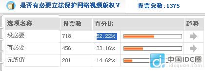 調(diào)查還顯示,52.22%的網(wǎng)友認(rèn)為沒必要立法保護(hù)網(wǎng)絡(luò)視頻版權(quán),僅有33.16%的網(wǎng)友認(rèn)為有必要立法保護(hù)。另外14.62%的網(wǎng)友未表明態(tài)度。