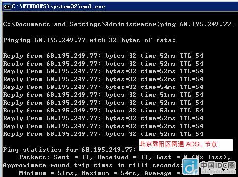 通過上面 3 個電信節(jié)點(diǎn)的測試基本可以看出康盛世紀(jì) A 系列主機(jī)雙線空間對于電信用戶的訪問質(zhì)量還是不錯的。當(dāng)然,具體到個人的情況還是要自己測試一下才知道的。 下面我們再來看看從網(wǎng)通測試節(jié)點(diǎn)訪問 A 系列主機(jī)雙線空間的情況,同樣我們在網(wǎng)通線路選擇 3 個測試節(jié)點(diǎn): 221.223.45.XYZ (北京市朝陽區(qū)網(wǎng)通 ADSL) 221.194.139.XYZ (河北省廊坊市網(wǎng)通) 60.22.152.XYZ(遼寧省盤錦市網(wǎng)通) 測試空間服務(wù)器同樣是上面的 60.195.249.77 (北京市電信通) 結(jié)果:測試沒有丟包,延時平均在 53ms 左右,訪問質(zhì)量良好!