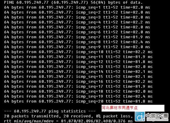 通過上面 3 個電信節(jié)點(diǎn)的測試基本可以看出康盛世紀(jì) A 系列主機(jī)雙線空間對于電信用戶的訪問質(zhì)量還是不錯的。當(dāng)然,具體到個人的情況還是要自己測試一下才知道的。 下面我們再來看看從網(wǎng)通測試節(jié)點(diǎn)訪問 A 系列主機(jī)雙線空間的情況,同樣我們在網(wǎng)通線路選擇 3 個測試節(jié)點(diǎn): 221.223.45.XYZ (北京市朝陽區(qū)網(wǎng)通 ADSL) 221.194.139.XYZ (河北省廊坊市網(wǎng)通) 60.22.152.XYZ(遼寧省盤錦市網(wǎng)通) 測試空間服務(wù)器同樣是上面的 60.195.249.77 (北京市電信通) 結(jié)果:測試沒有丟包,平均延時 82ms 左右,延時偏大,訪問質(zhì)量也還是不錯的。